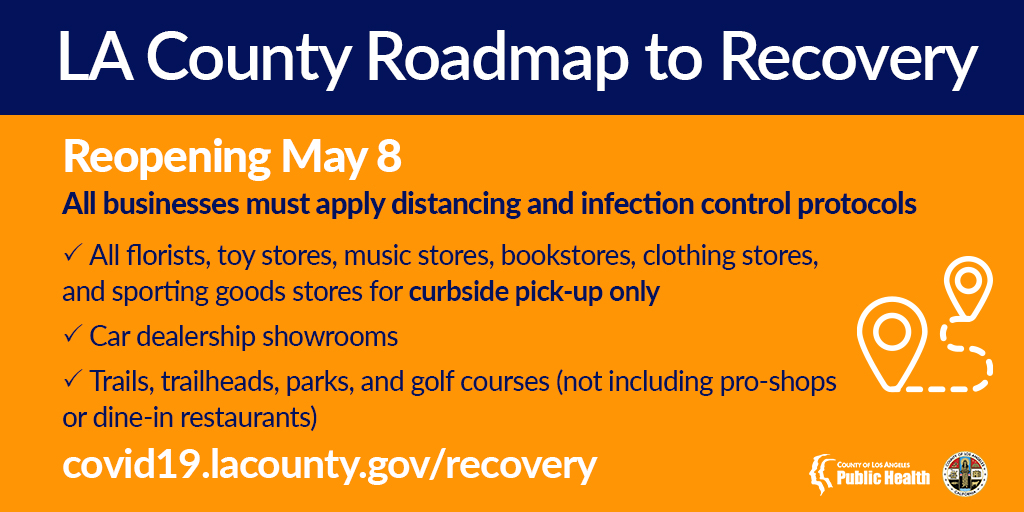 L.A. County Supervisor Kathryn Barger said trails, golf courses, florists, car dealers and retail businesses selling toys, books, clothing, sporting goods and music can open as soon as Friday with curb-side pickup only.