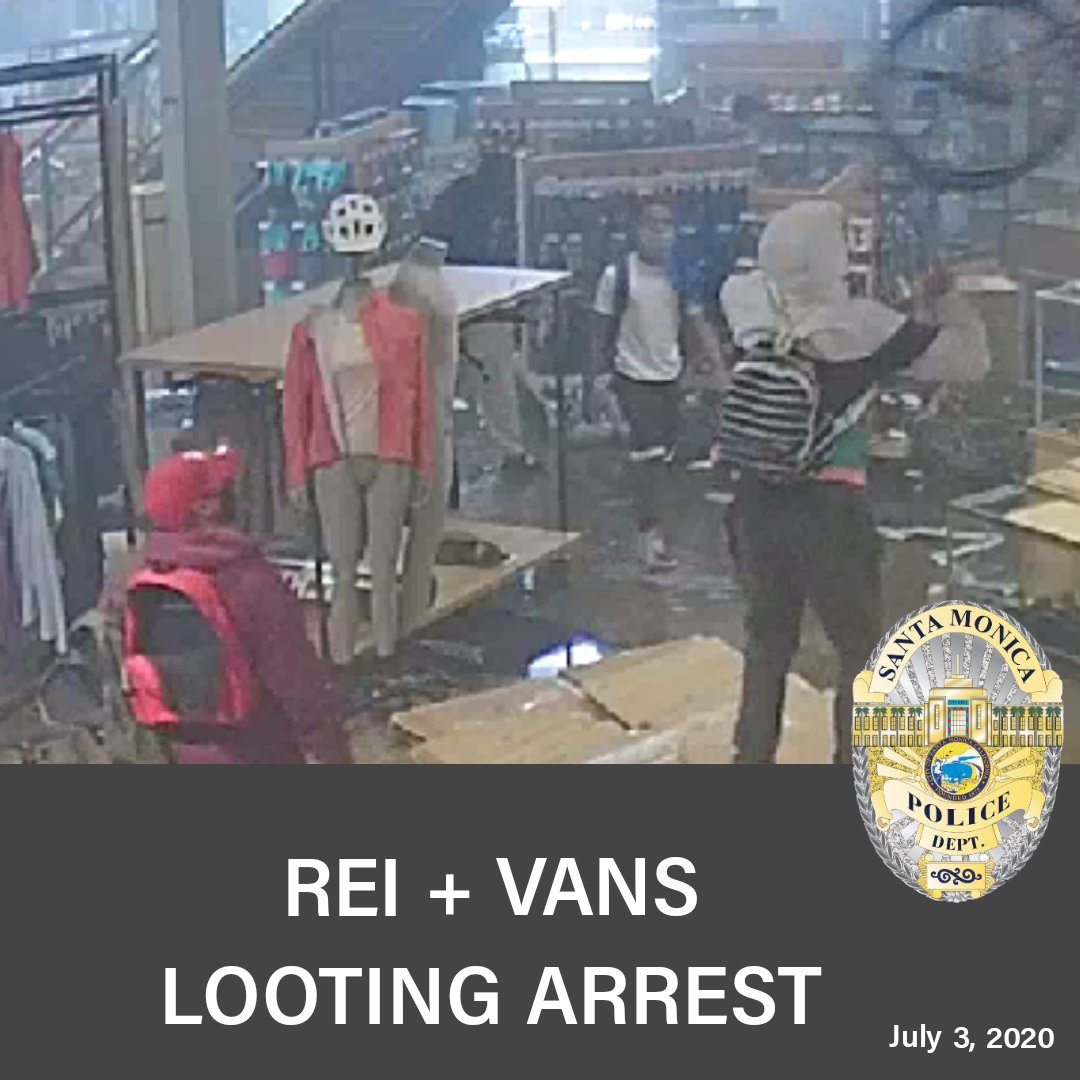 According to their press release, Detectives with the Santa Monica Police Department scoured hours of security video and social media posts. A suspect vehicle was identified by searching social media videos of the civil unrest. It showed a vehicle license plate with two suspects loading various items from REI. After reviewing REI security video, the two subjects were identified inside the store removing thousands of dollars of merchandise. During the investigation one of individuals was also identified as the suspect of an assault on a police officer.