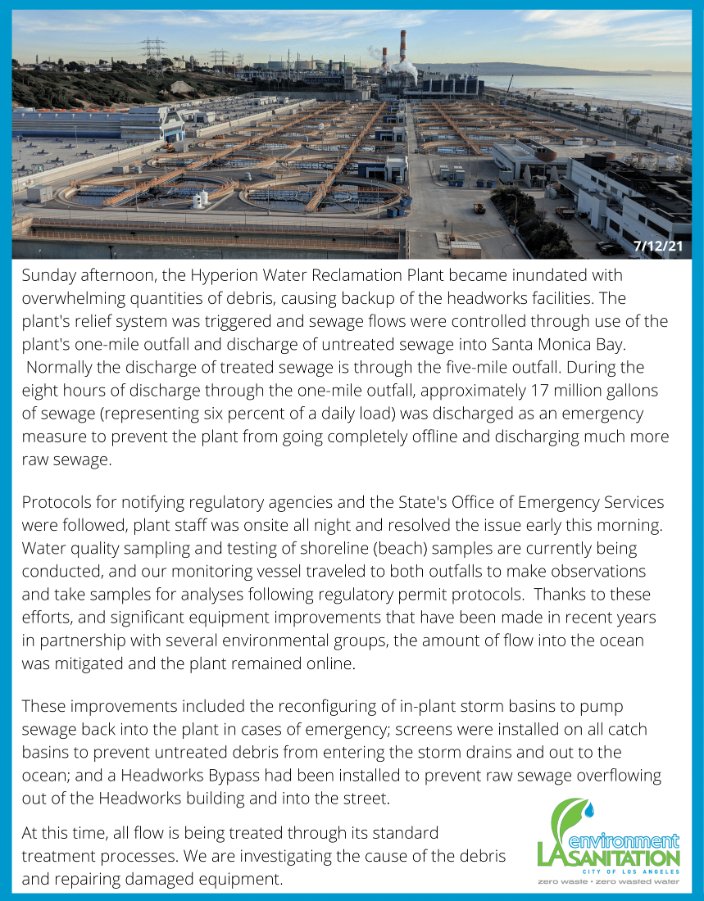 LA Sanitation & Environment's Statement regarding Hyperion Water Reclamation Plant discharge today.:
