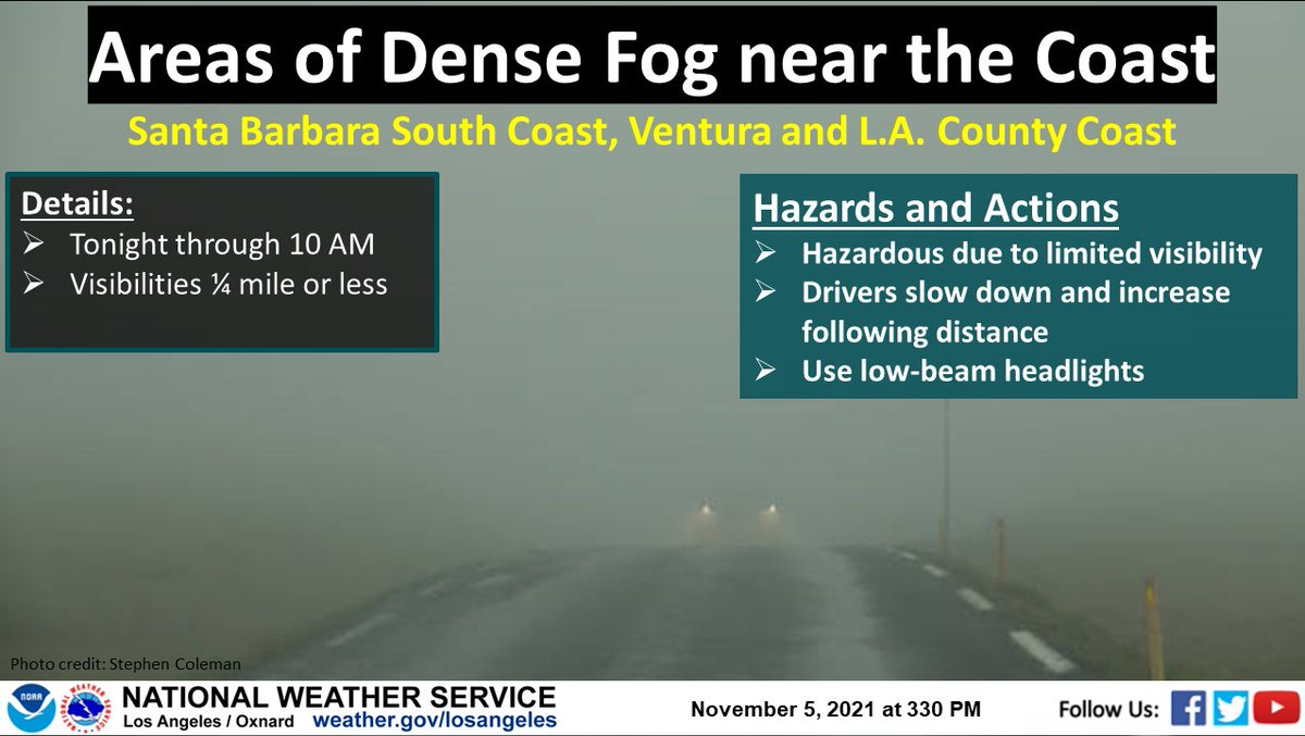 Dense fog expected tonight through mid-morning Saturday, along the Santa Barbara South Coast, Ventura and LA Coasts. Use extra caution driving! Areas of visibility to 1/4 mile or less expected.