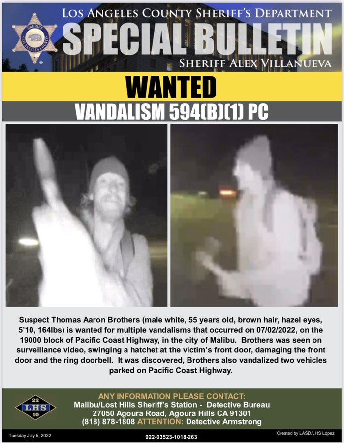 Suspect Thomas Aaron Brothers (male white, 55 years old, brown hair, hazel eyes, 5’10, 164lbs) is wanted for multiple vandalisms that occurred on 07/02/2022, on the 19000 block of Pacific Coast Highway, in the city of Malibu. Brothers was seen on surveillance video, swinging a hatchet at the victim’s front door, damaging the front door and the ring doorbell. It was discovered, Brothers also vandalized two vehicles parked on Pacific Coast Highway.