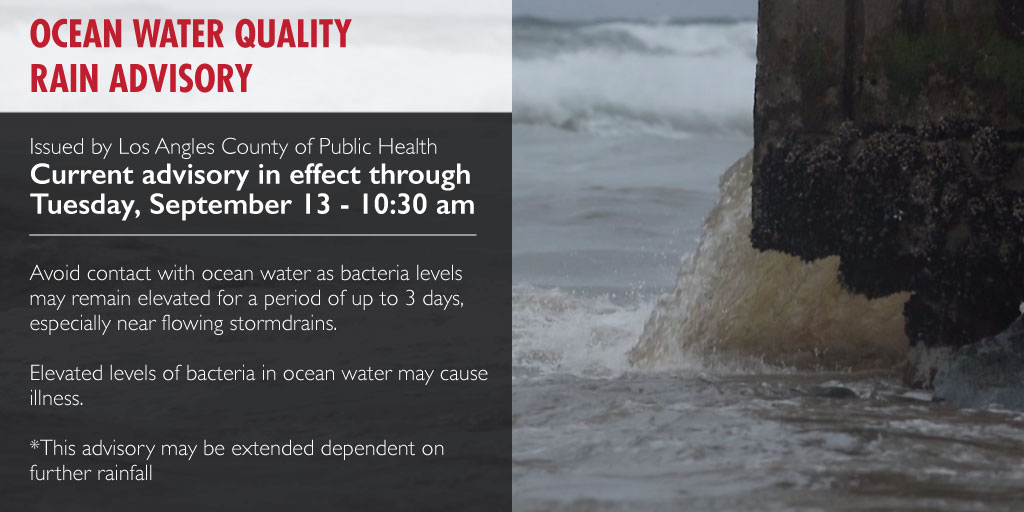 An Ocean Water Quality Rain Advisory has been declared for all Los Angeles County beaches. The advisory will be in effect at least until 07:30 am, Friday, December 17, 2021 (72 hours after significant rainfall). Beach users should avoid water contact for at least 72 hours after significant rainfall. This advisory may be extended depending upon further rainfall.