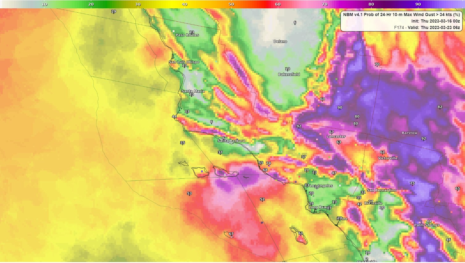 Tuesday Night through Wednesday looks windy, with the potential for widespread Gale Force winds and hazardous seas over the waters. Here are the probabilities / chances of gale force winds (35+ mph / kts).