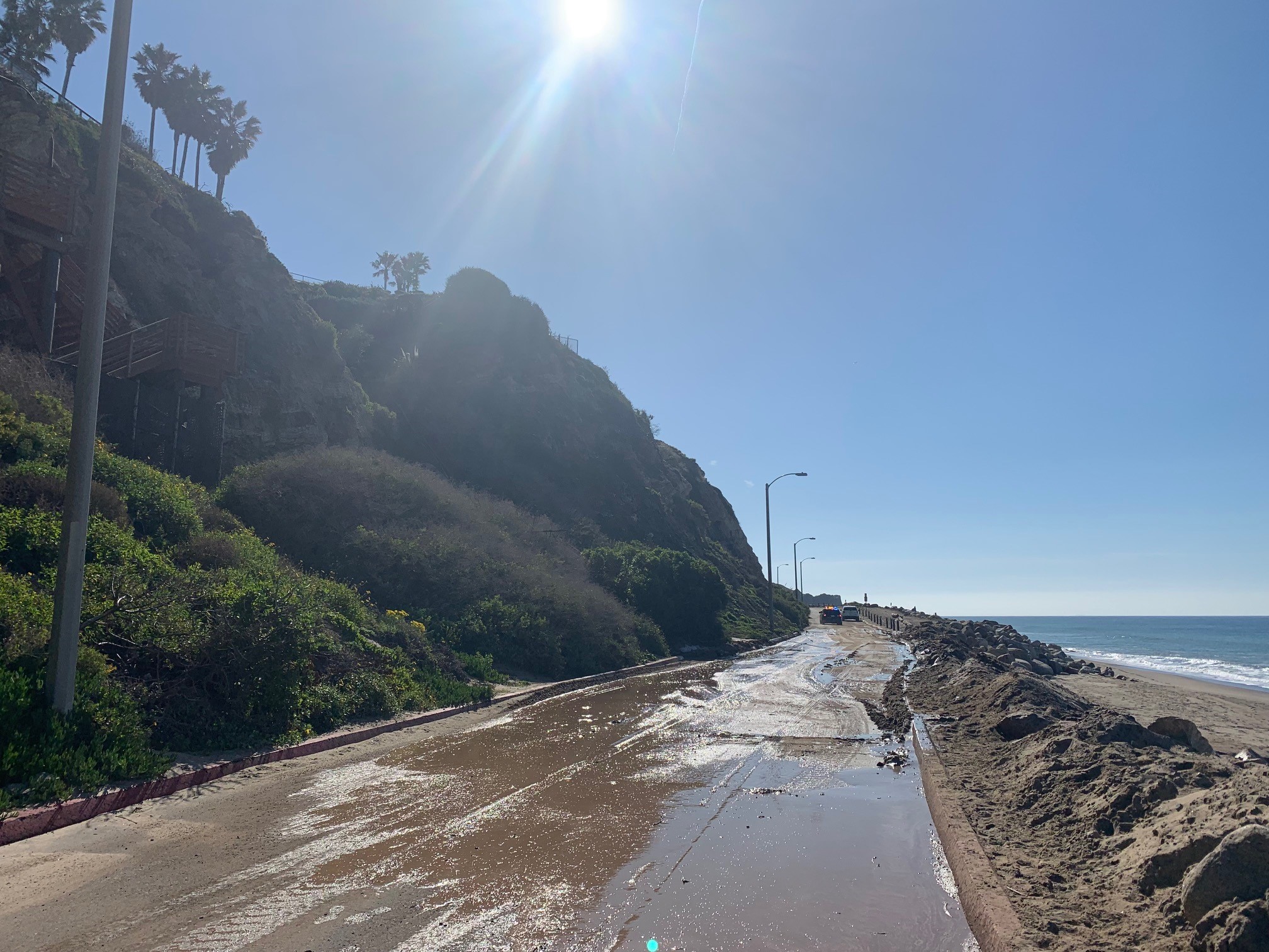 The Los Angeles County Beaches and Harbors Dept. has closed the Point Dume access road at the end of Westward Beach Road due to a debris flow onto the road from a property on Birdview Avenue and potential land shift and bluff failure, with concern for more. The public should avoid the area, beware falling rocks and debris and land movement. No current estimate for reopening.