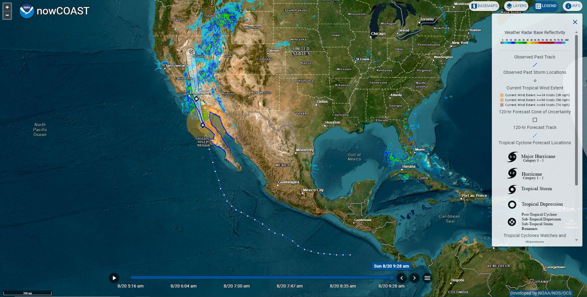 The center of Tropical Storm Hilary is currently located off the coast of Baja California and is spreading rainfall into Southern California. This image shows the track history of Tropical Cyclone Hilary and the forecast track as it continues its northward progression.