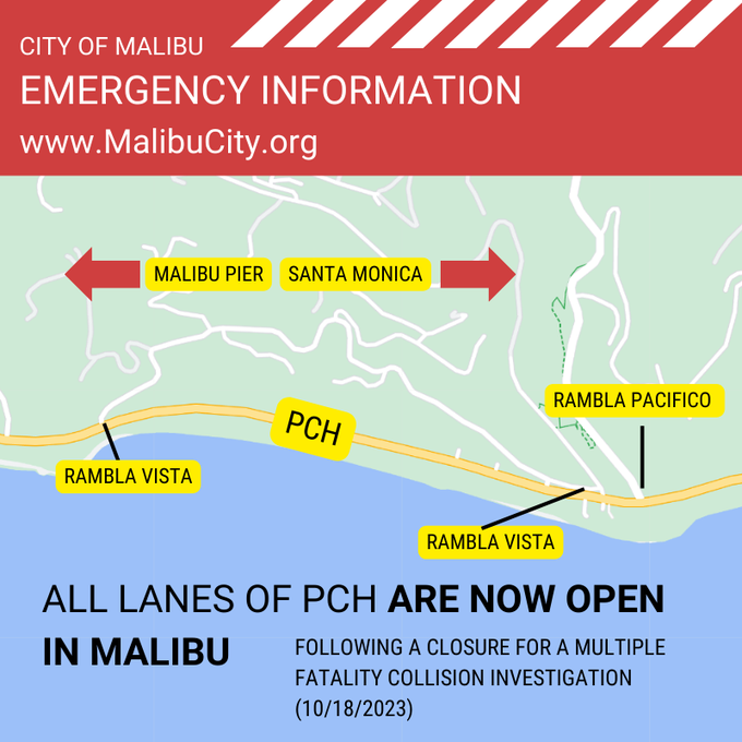 All lanes of PCH are OPEN in Malibu following a closure at Rambla Vista starting Tuesday night for investigation of a multiple fatality collision.