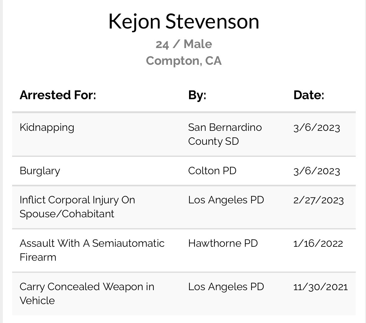Stevenson, Kejon (DOB: 03/03/1999) of Los Angeles.