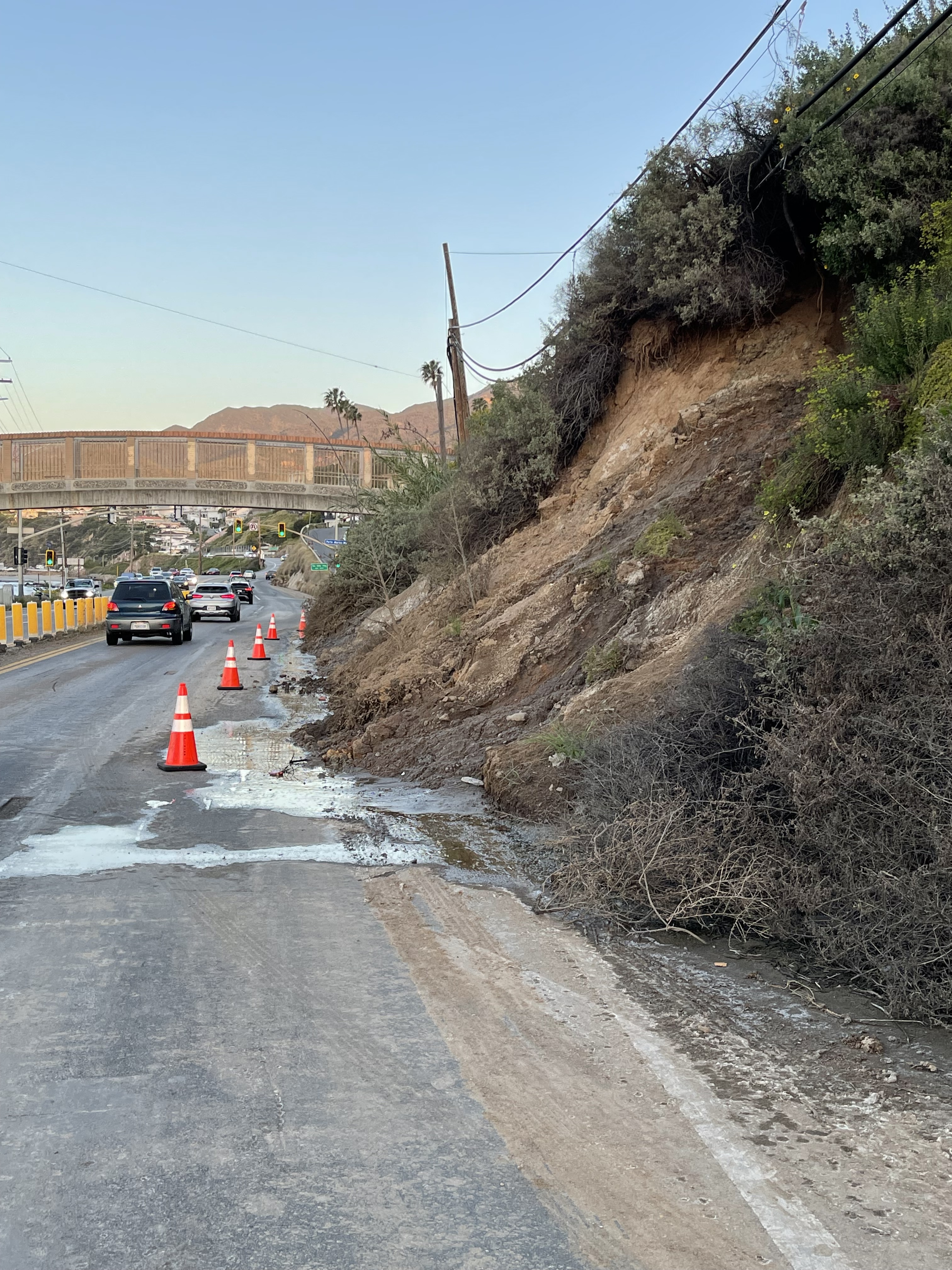 Update as of 10 a.m. March 14, Pacific Coast Highway at Porto Marina Way in Pacific Palisades is reduced to one lane on the Northbound side due to a mud/rock slide. A geologist was on site examining the slide. Caltrans said they must allow the slope to dry more before taking further action.