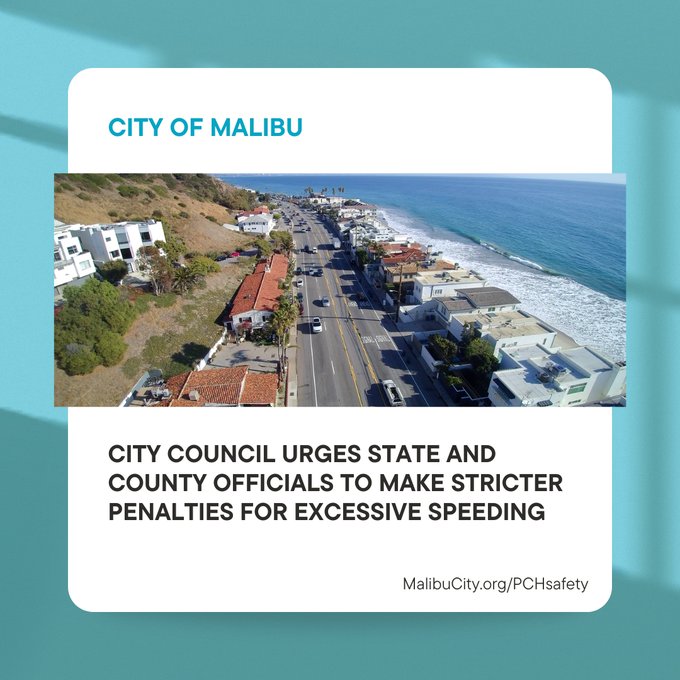 Malibu City Council sent a letter urging State & County officials to make changes to CA Vehicle Code for safety on Pacific Coast Highway. If caught going +100 MPH, lose your license for 3 months; going twice the speed limit, lose your license for 1 month (& more).