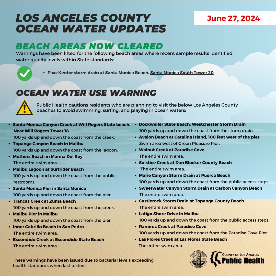The Los Angeles County Department of Public Health cautions residents who are planning to visit the below Los Angeles County beaches to avoid swimming, surfing, and playing in ocean waters: