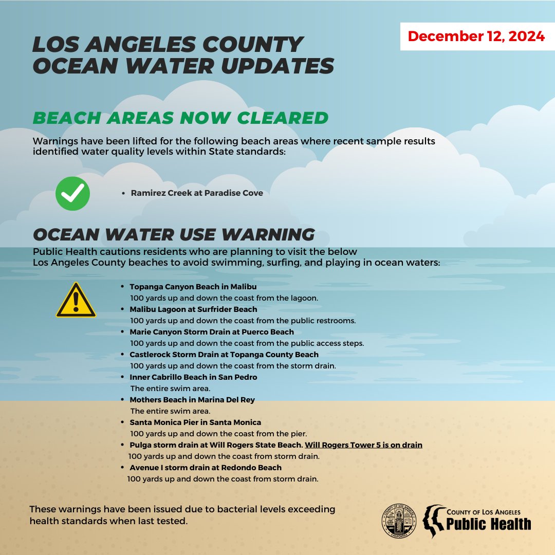 The Los Angeles County Department of Public Health cautions residents who are planning to visit the below Los Angeles County beaches to avoid swimming, surfing, and playing in ocean waters: