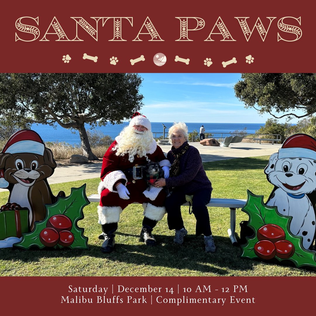 HAPPY HOWL-IDAYS 🦴 Enjoy the holiday season with your furry friends at Santa Paws on Saturday, December 14, 10 AM – 12 PM! Take a photo with Santa at Malibu Bluffs Park.