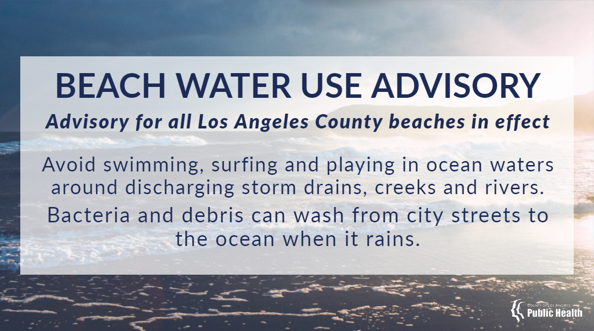 Because of the recent rainfall, Los Angeles County Health Officer, Muntu Davis, MD, MPH, is cautioning residents who are planning to visit Los Angeles County beaches to avoid swimming, surfing, and playing in ocean waters around discharging storm drains, creeks, and rivers. Bacteria, chemicals, debris, trash, and other public health hazards from city streets and mountain areas are likely to contaminate ocean waters at and around these outlets after a rainfall. Individuals who enter the water in these areas could become ill.