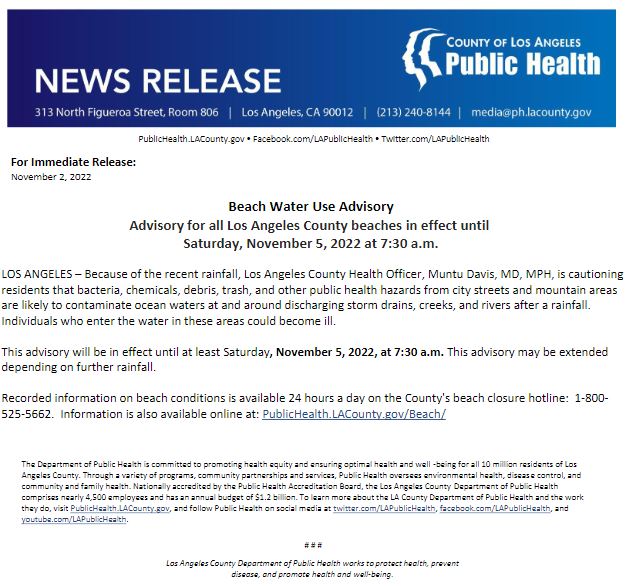 Advisory for all Los Angeles County beaches in effect until Saturday, November 5, 2022 at 7:30 a.m.