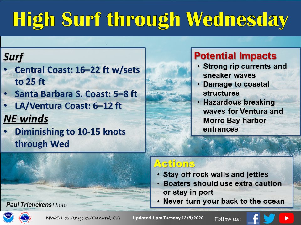 * ADDITIONAL DETAILS...Surf will be highest on exposed west facing beaches. Short period northeast wind waves of 3 to 6 feet will create hazardous conditions near northeast harbor entrances such as Avalon and Two Harbors on Catalina Island through this evening. The surf will begin to slowly subside tonight through Wednesday. It will still be elevated early Thursday though below advisory criteria.