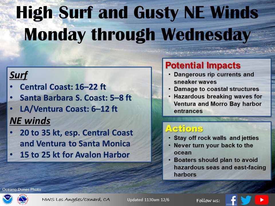 A large, long-period NW swell combined with gusty NE winds will create high surf along all beaches and hazardous seas across much of the coastal waters Mon through Wed. Dangerous rip currents and large breaking waves are likely.