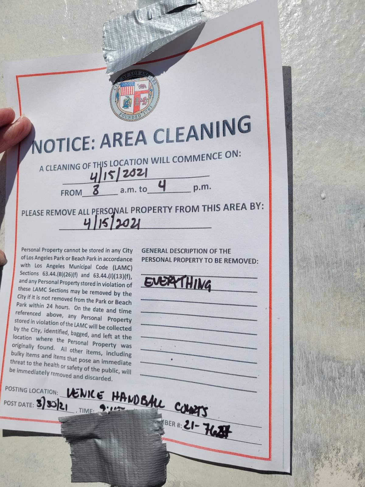 The homeless encampments that are in the Venice Handball Courts are going to be cleaned out in two weeks.