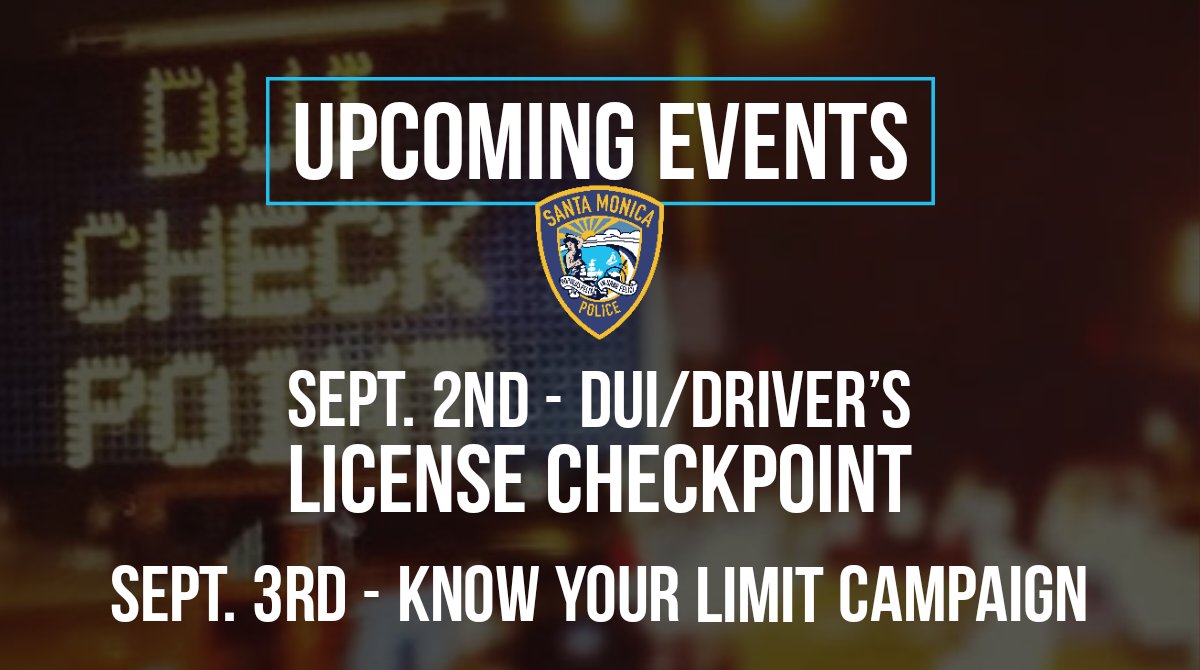On Friday, September 2, 2022 the Santa Monica Police Department (SMPD) will conduct a driving under the influence (DUI) Checkpoint from 6 p.m. to 3 a.m. at an undisclosed location. The Department will also host a "Know Your Limit" event on Saturday, September 3rd from 7 p.m. to midnight.