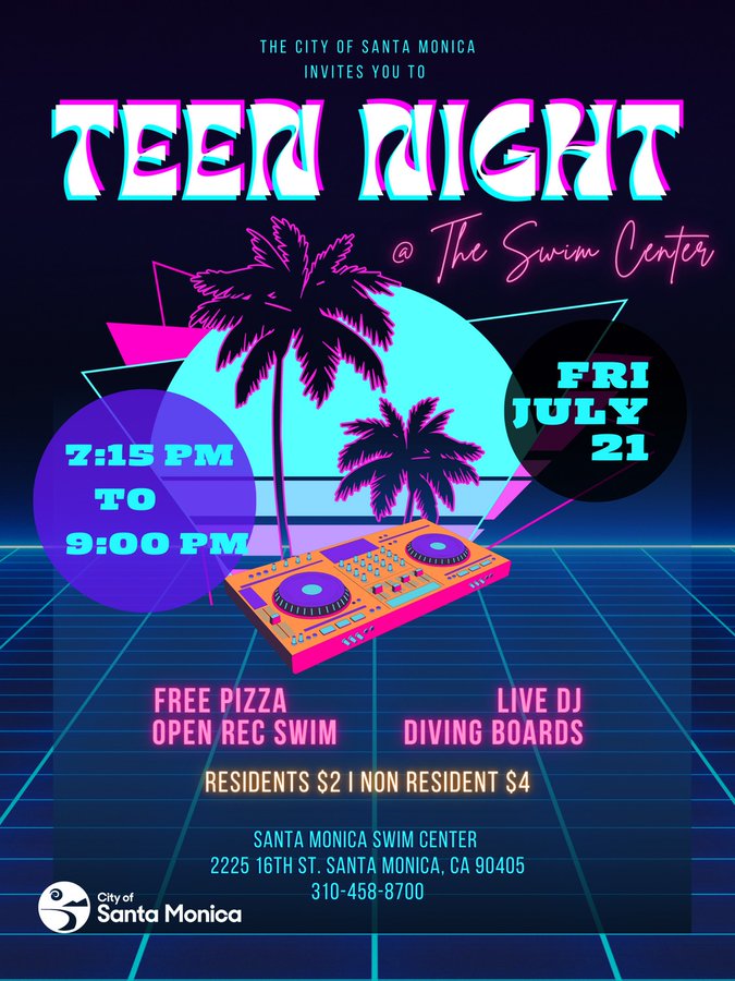 Teen Night at the Santa Monica Swim Center! Teens 14 - 18 can enjoy free pizza, a live DJ, pool floats, and an obstacle course from 7:15 to 9 p.m. tonight!