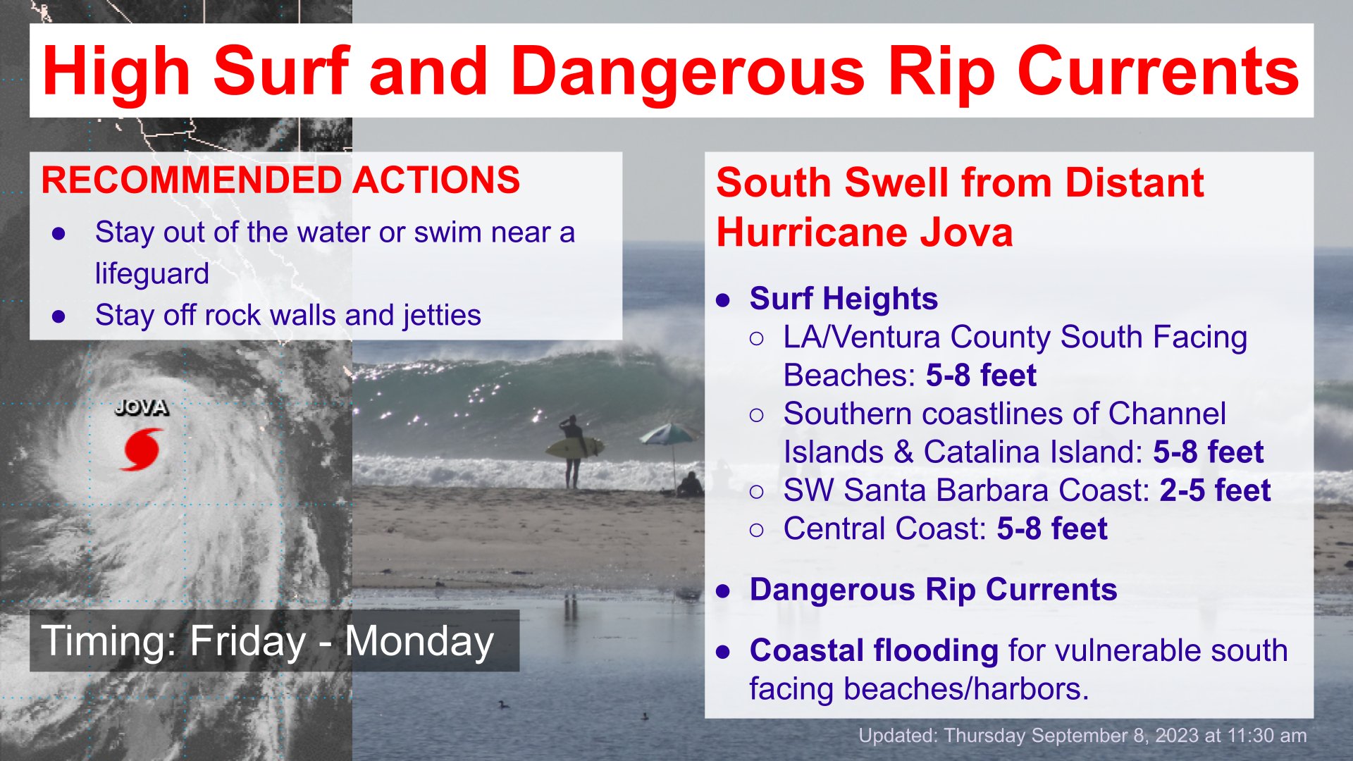 South swell from distant Hurricane Jova will bring #highsurf & strong rips to LA & Ventura Co south facing beaches & the southern island coasts tonight into Monday.