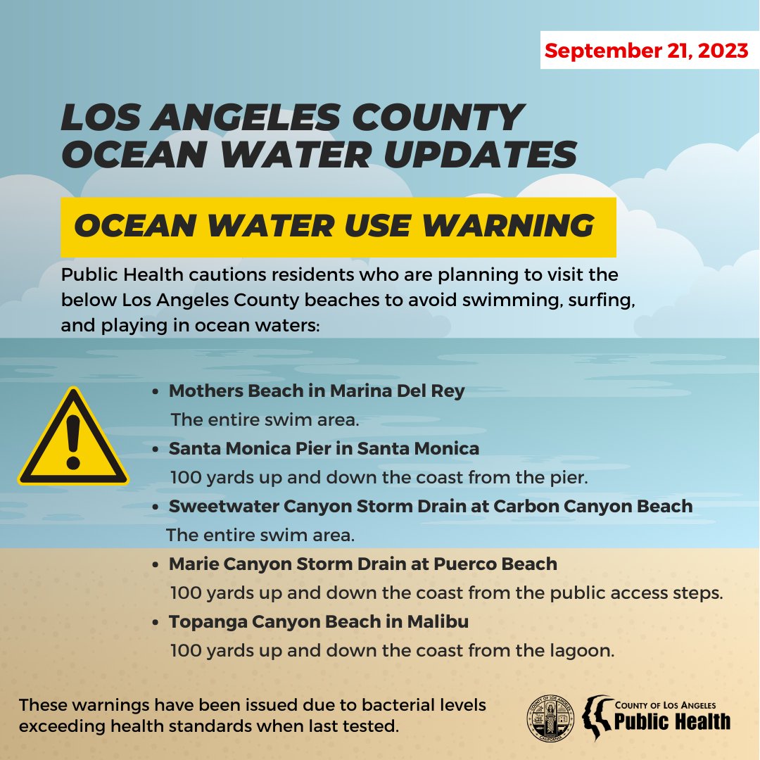 The Los Angeles County Department of Public Health cautions residents who are planning to visit the below Los Angeles County beaches to avoid swimming, surfing, and playing in ocean waters: