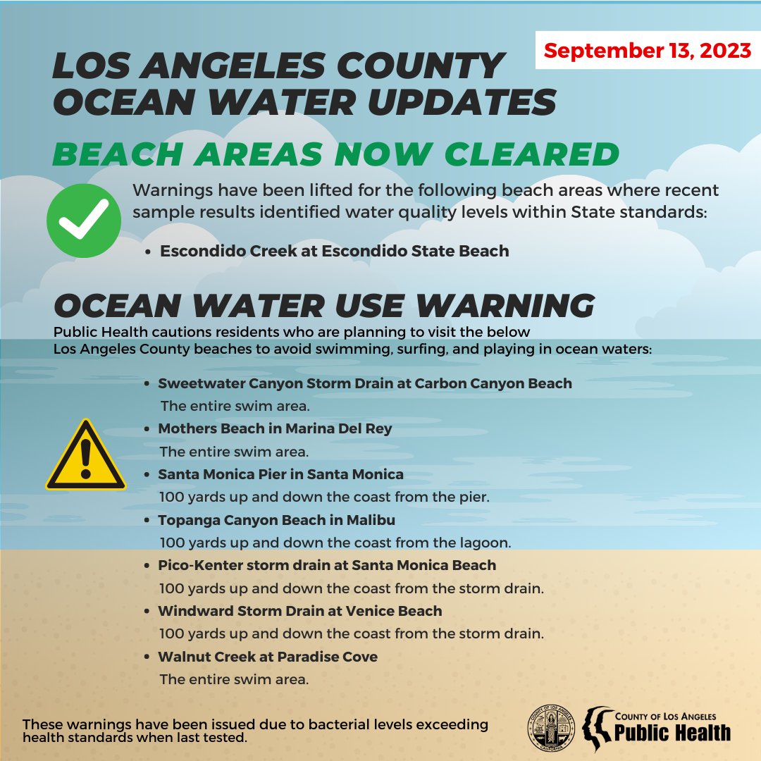 The Los Angeles County Department of Public Health cautions residents who are planning to visit the below Los Angeles County beaches to avoid swimming, surfing, and playing in ocean waters: