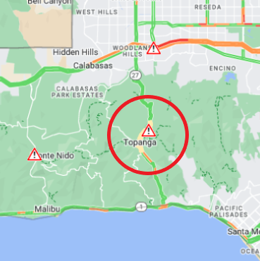 State Route 27 (Topanga Canyon Blvd.) is CLOSED from Robinson Rd. to Topanga Canyon School Rd. due to flooding. Unknown duration. Avoid the area.