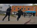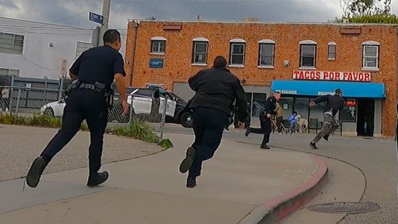 Los Angeles Police Officers chase down a suspect in Venice ob Sunday afternoon. Two officers got injuried in the takedown of the fleeing man.